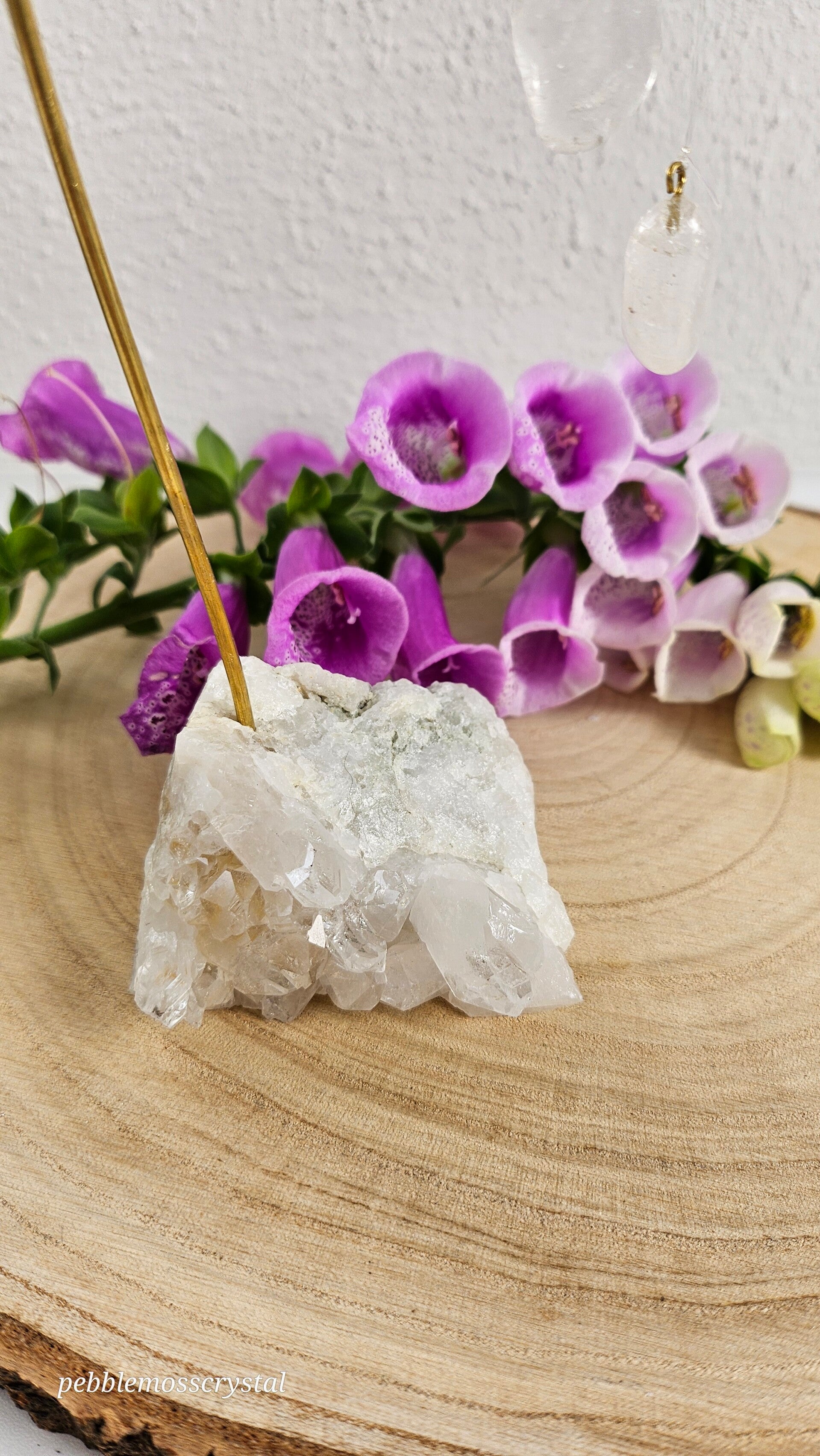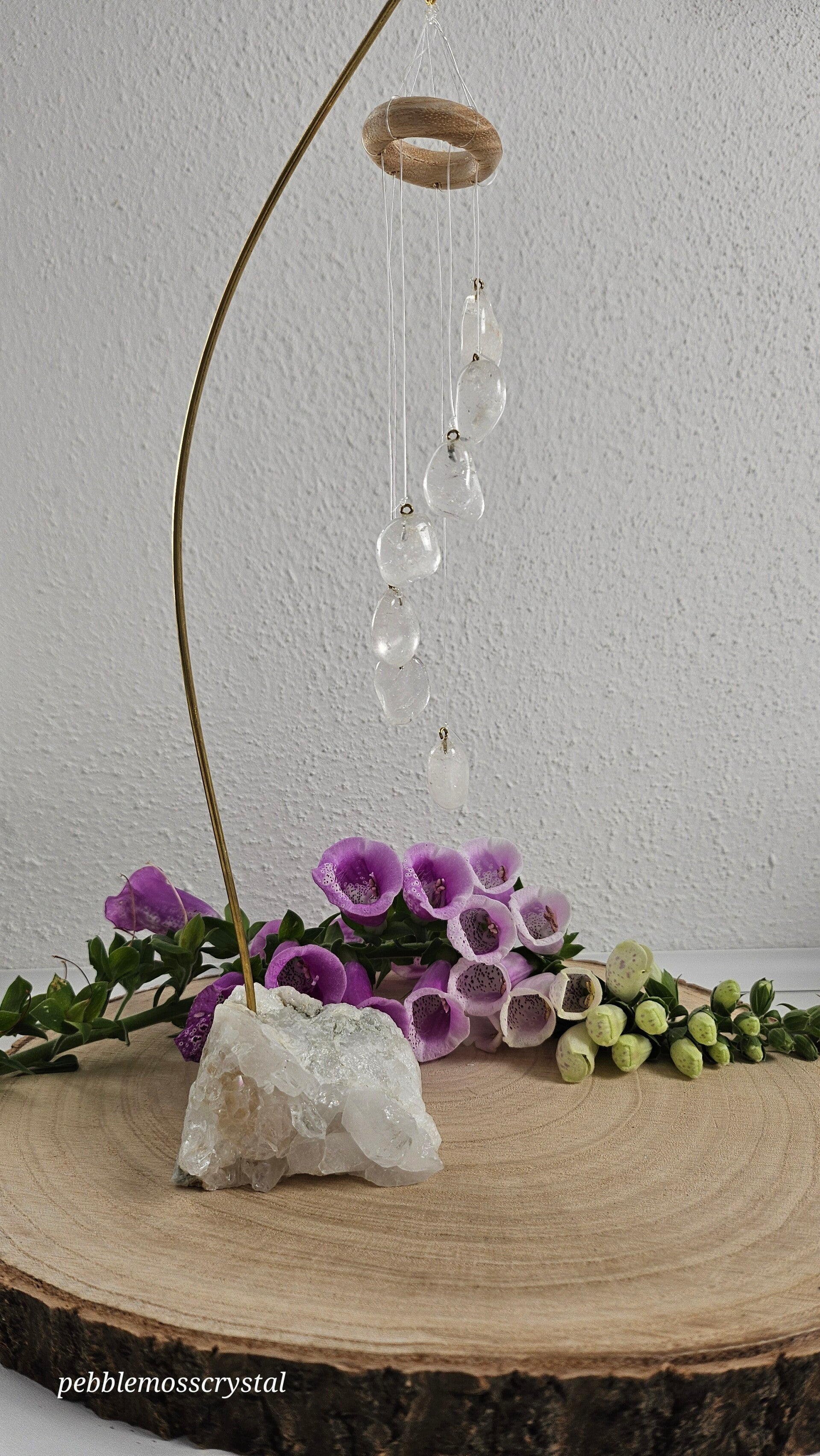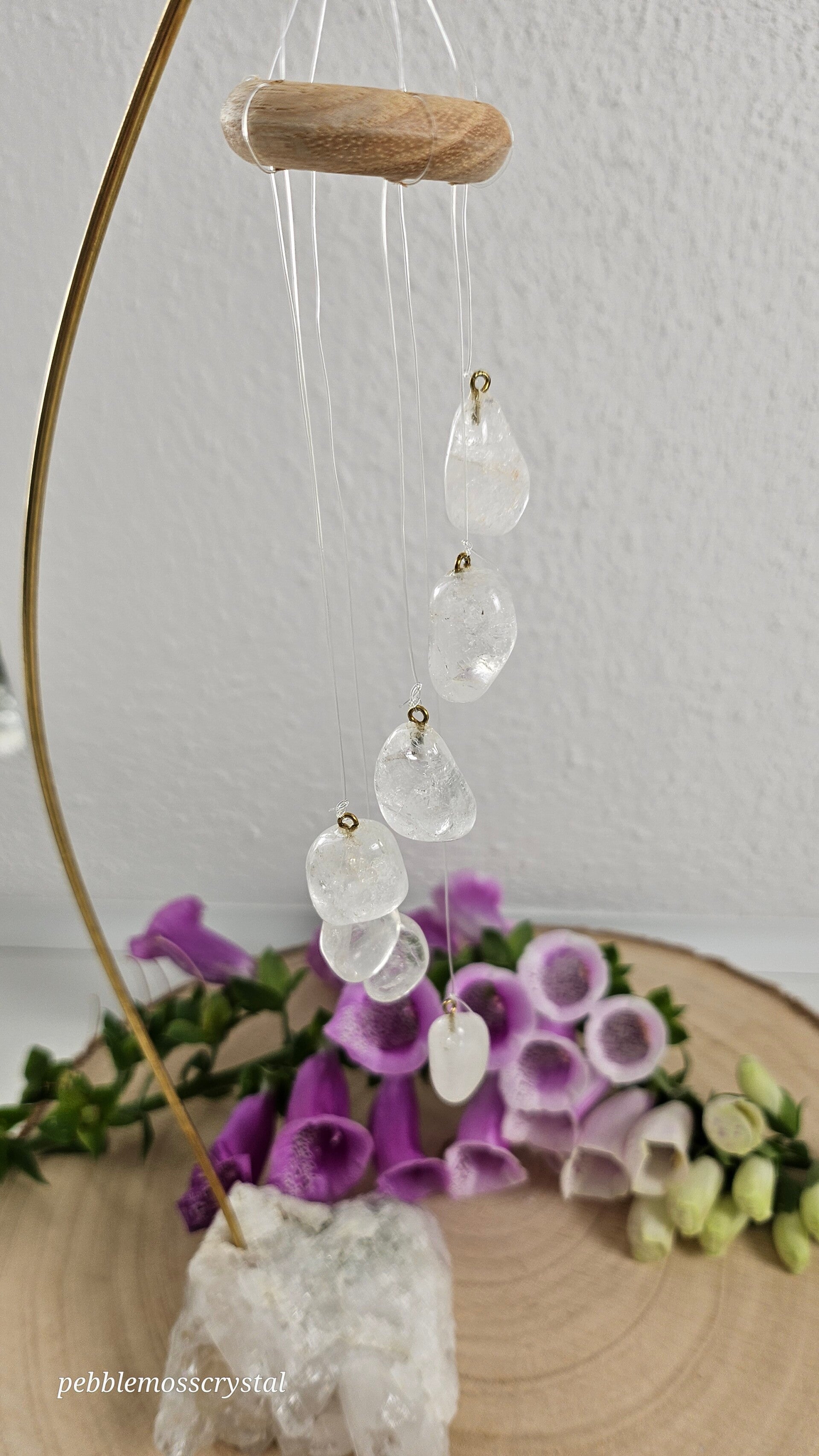 schönes Tisch Windspiel mit klaren Bergkristall Hänger auf Bergkristall Basis mit tollen großen Spitzen